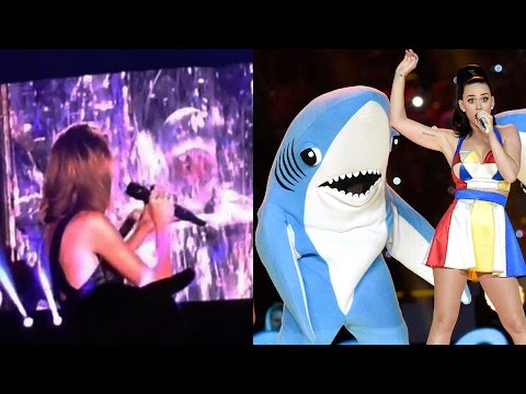 Taylor Bad Blood şarkısını söylerken, Katy Perry'nin bu seneki Super Bowl performansıyla ün kazanmış sol köpek balığı kostümü bir anda ortaya çıktı! Köpek balığını gören Taylor'ın tepkisi ise paha biçilmezdi.