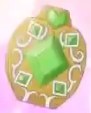 Nephrite's Jewel Charm is orange and oval-shaped with white decor. There is a large green diamond in the middle, surrounded by four smaller diamonds and a green heart at the top.